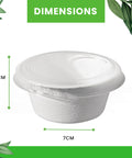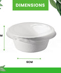 Product Specifications: ✓ Size: 60ml capacity ✓ Material: Sugarcane bagasse ✓ Color: Pristine white ✓ Style: Round pot with secure lid ✓ Temperature Range: -20°C to 85°C