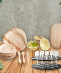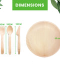 Bundle Contents (440-piece Set): ✓ 25cm Round Palm Leaf Dinner Plates (100 pieces) ✓ 18cm Round Palm Leaf Plates (100 pieces) ✓ 14cm Round Palm Leaf Round Bowls (100 pieces) ✓ 16cm Wooden Cutlery (100 pieces), ✓ 55cm Round Palm Leaf Platters (30 pieces) ✓ Champagne Trays Black (10 pieces)