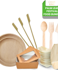 500-Piece Festival Food Bundle | Palm Leaf Plates, Wooden Forks, Bamboo Skewers, Square Takeaway Boxes & Pinewood Boats Set | (100 persons)