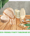 Host the perfect eco-conscious event with our comprehensive 500-piece party bundle, featuring premium palm leaf plates, bowls, platters, sustainable wooden cutlery, and pinewood serving boats.
