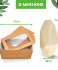 Bundle Contents (500-piece Set): ✓ 18cm Round Palm Leaf Plates (100 pieces) ✓ 16cm Wooden Cutlery Set (100 pieces), ✓ XL (19 x 10cm) Pinewood Serving Boats (100 pieces) ✓ 12cm Teppo Gushi Skewers (100 pieces) ✓ 19cm Square Takeaway Brown Boxes (100 pieces)